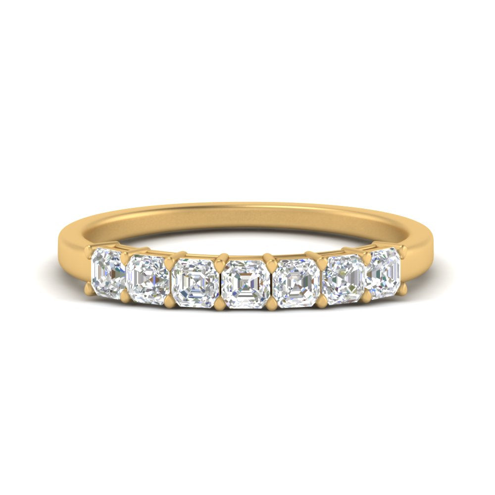 When buying an Asscher cut wedding band, choose a metal such as white gold, yellow gold, rose gold, black gold, or platinum to suit your style and ensure durability. Select natural or lab-grown diamonds, or incorporate gemstone accents to add distinctive flair. Check for secure gemstone settings. Explore designs like 5-stone, eternity, knot ring, 7-stone, etc., that highlight the Asscher cut’s characteristic “hall of mirrors” effect. Choose a band that complements your engagement ring for a cohesive and elegant bridal set.