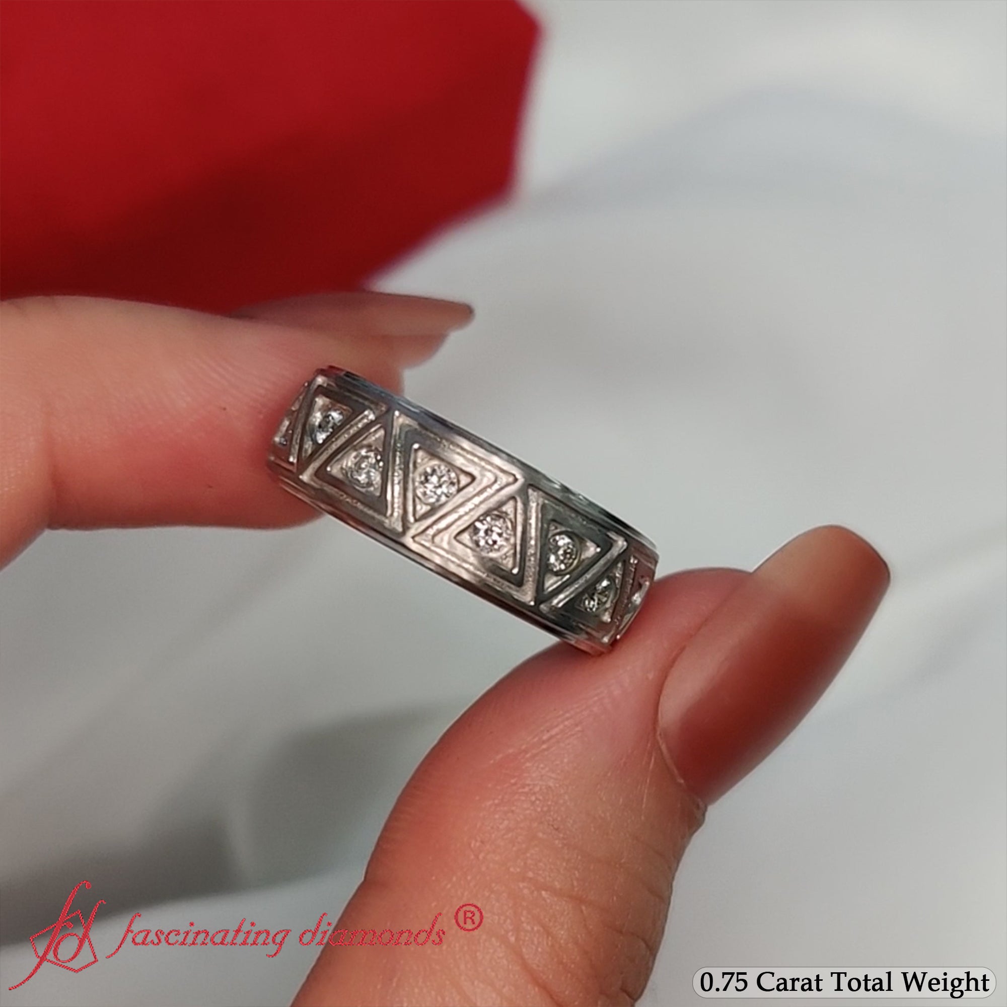 For guys who want a bit of shine, mens platinum diamond wedding bands add refined sparkle without losing their masculine edge. A platinum diamond ring for men might feature a single center diamond or a sleek row of channel-set stones. These details create a clean, structured look while keeping the focus on craftsmanship.