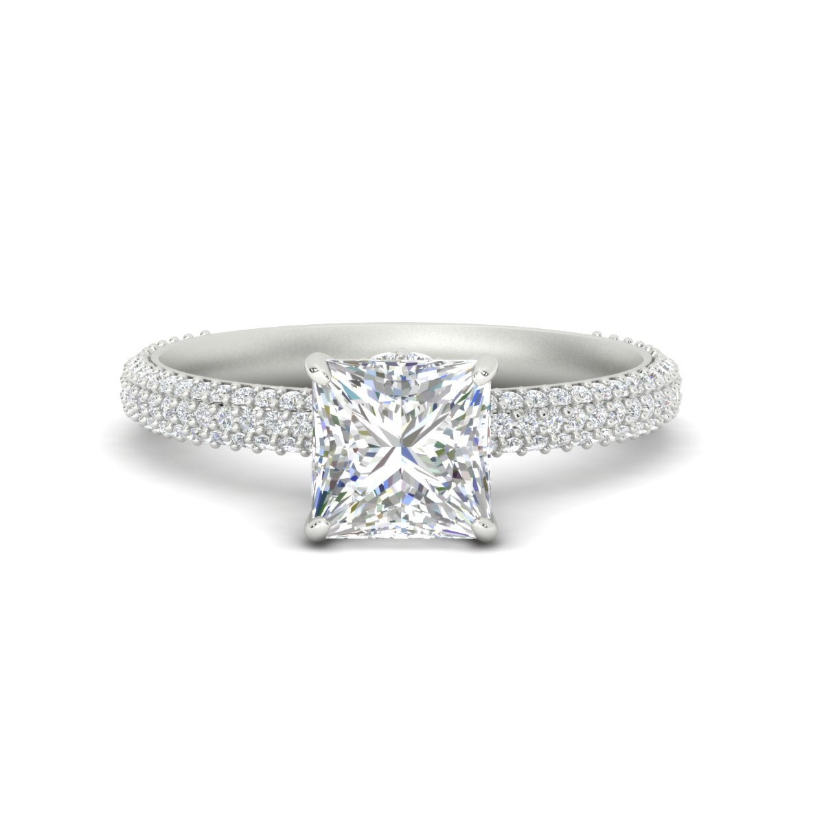 Pavé settings complement most diamond shapes, including round, oval, cushion, and princess cuts. The setting enhances the overall design without overpowering the center stone.