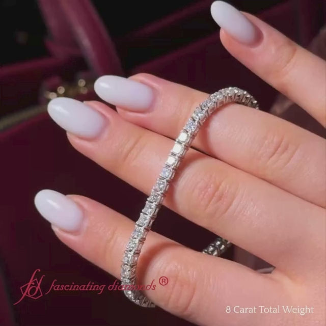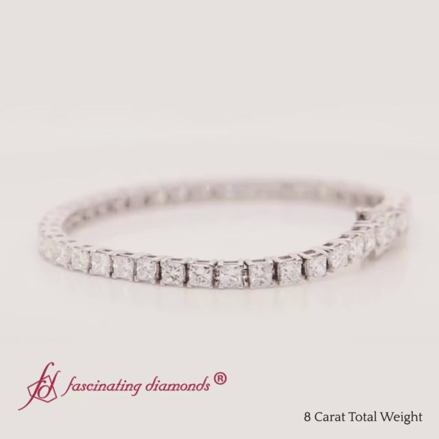 The basket setting on the 8 Ct Princess Cut Basket Tennis Bracelet from Fascinating Diamonds refers to the prong setting that securely holds each princess-cut stone. It is designed to maximize light exposure, enhancing the continuous sparkle of the diamonds.