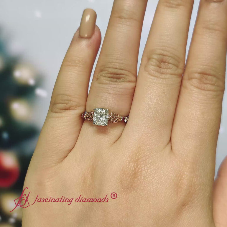 A beautifully handcrafted two-tone engagement ring showcasing a brilliant cushion-cut lab-grown diamond, accented with intricate Celtic knot detailing—symbolizing eternal love and unity.