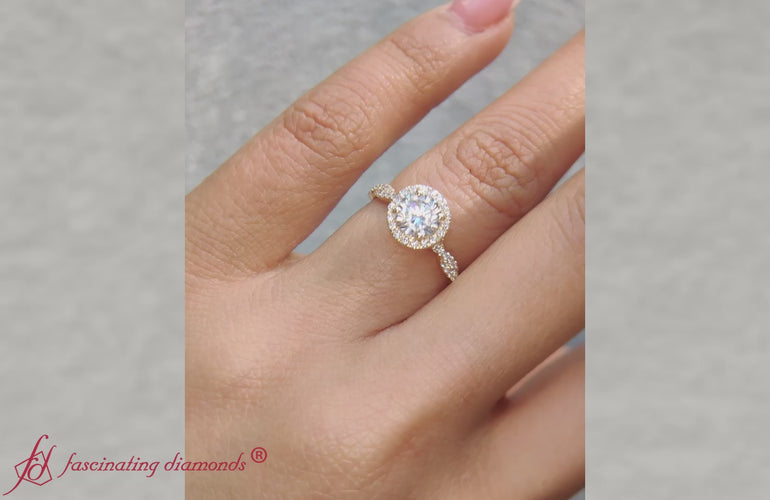 The round brilliant cut maximizes light return with its 58 facets, creating unmatched sparkle and fire. In the Classic Vine Halo setting, this brilliance is framed by a delicate vine-style halo and pavé band, which enhances the round diamond’s symmetry and gives the ring a timeless, romantic look that flatters every hand shape.