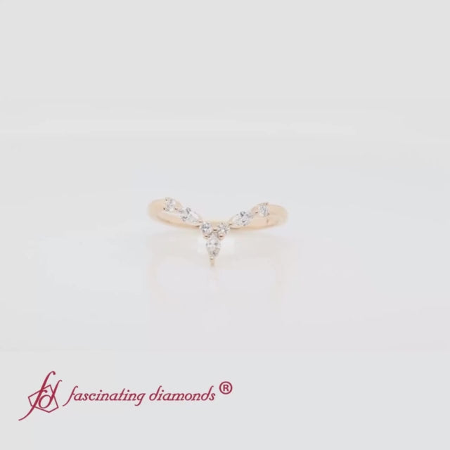 It features a crown or V-shaped chevron design with alternating marquise and round stones for a regal, elegant look.