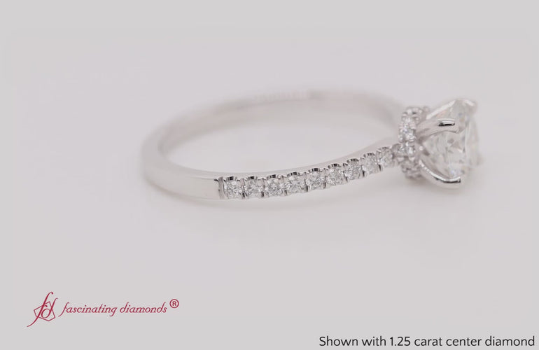 Accent Stones: The accent stones of 0.35 ct. arranged beautifully in a U prong setting in Half Coverage Hidden Halo Engagement Ring. Depending on the center stone cut & carat weight, the ring includes thirty accent stones.