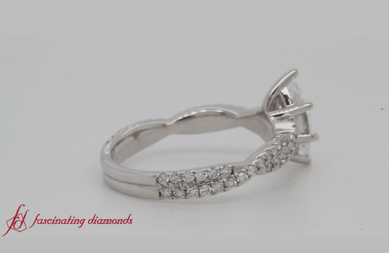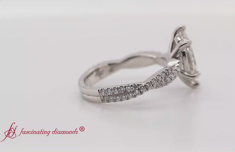 The Marquise Cut Twisted Vine Delicate Engagement Ring from Fascinating Diamonds highlights a center diamond set in a four-prong setting. The band features entwined strands adorned with pavé-set round-cut diamonds, creating an elegant vine-inspired look. This design captures the essence of enduring love and natural beauty.