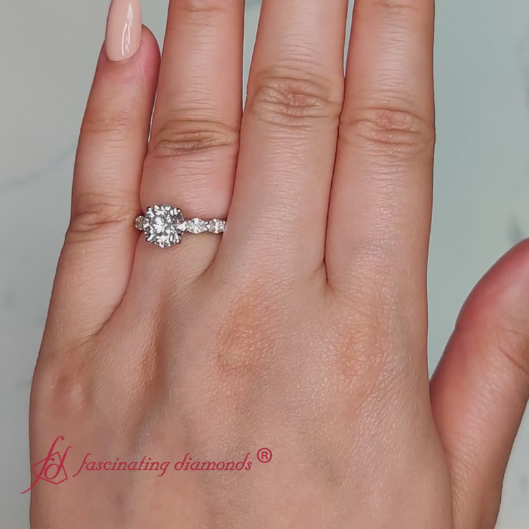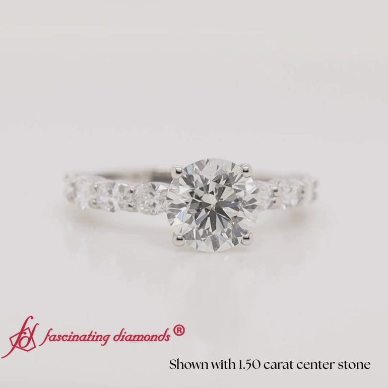 The Oval Accented Round Cut Engagement Ring from Fascinating Diamonds highlights a center diamond set in a secure prong setting. The band is elegantly adorned with oval diamond accents set in prong setting, creating a graceful rhythm of sparkle along the shank.