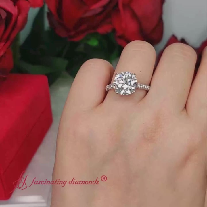 A hidden halo is a circle of small diamonds placed beneath the center stone. It adds extra brilliance without distracting from the solitaire look, giving the ring a subtle but luxurious sparkle.