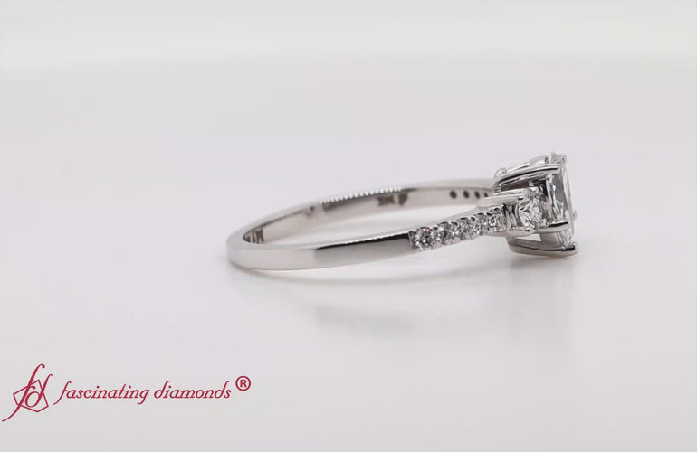 Center Stone Shapes & Cuts: The center stone diamond shapes & cuts include Asscher cut, Cushion cut, Emerald cut, Heart shape, Marquise cut, Oval shape, Princess cut, Radiant cut, and Round cut for the 1 Ct Pear Shaped Petite Micropave Three Stone Ring.