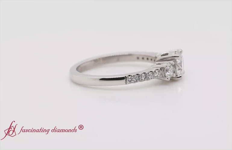 Center Stone Shapes & Cuts: The center stone diamond shapes & cuts include Asscher cut, Cushion cut, Emerald cut, Heart shape, Marquise cut, Oval shape, Pear shape, Princess cut and Radiant cut for the 1 Ct Round Cut Petite Micropave Three Stone Ring.