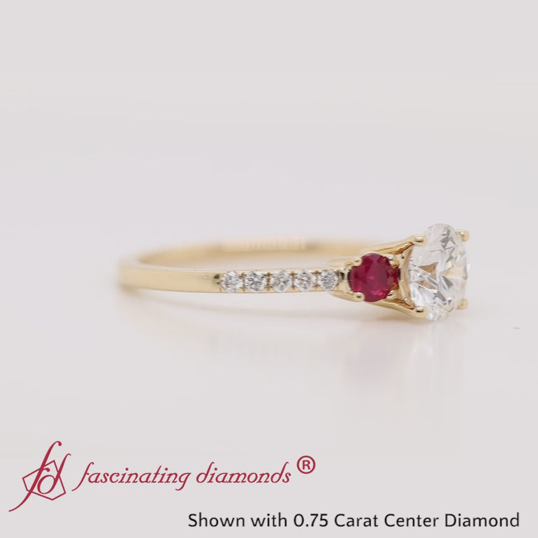 Accent Stone Types: Accent stone choices for the 1 Ct Round Cut Petite Micropave Three Stone Ring are White Diamond, Blue Sapphire, Pink Sapphire, Orange Sapphire, Green Emerald, Red Ruby, and Black Diamond.