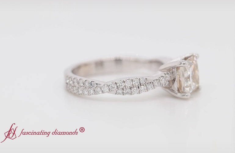 The Princess Cut Twisted Vine Delicate Engagement Ring from Fascinating Diamonds highlights a center diamond set in a four-prong setting. The band features entwined strands adorned with pavé-set round-cut diamonds, creating an elegant vine-inspired look. This design captures the essence of enduring love and natural beauty.