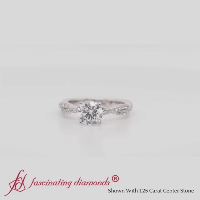 The Round Cut Twisted Vine Delicate Engagement Ring from Fascinating Diamonds highlights a center diamond set in a four-prong setting. The band features entwined strands adorned with pavé-set round-cut diamonds, creating an elegant vine-inspired look. This design captures the essence of enduring love and natural beauty.