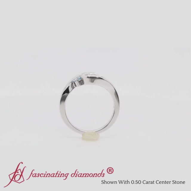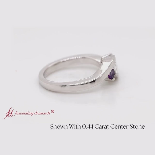 The Lab Grown Oval Shaped Twist 3 Stone Engagement Ring from Fascinating Diamonds® stands out with its elegant twisted band design, symbolizing unity, and its three-stone setting that represents the past, present, and future of your love story.
