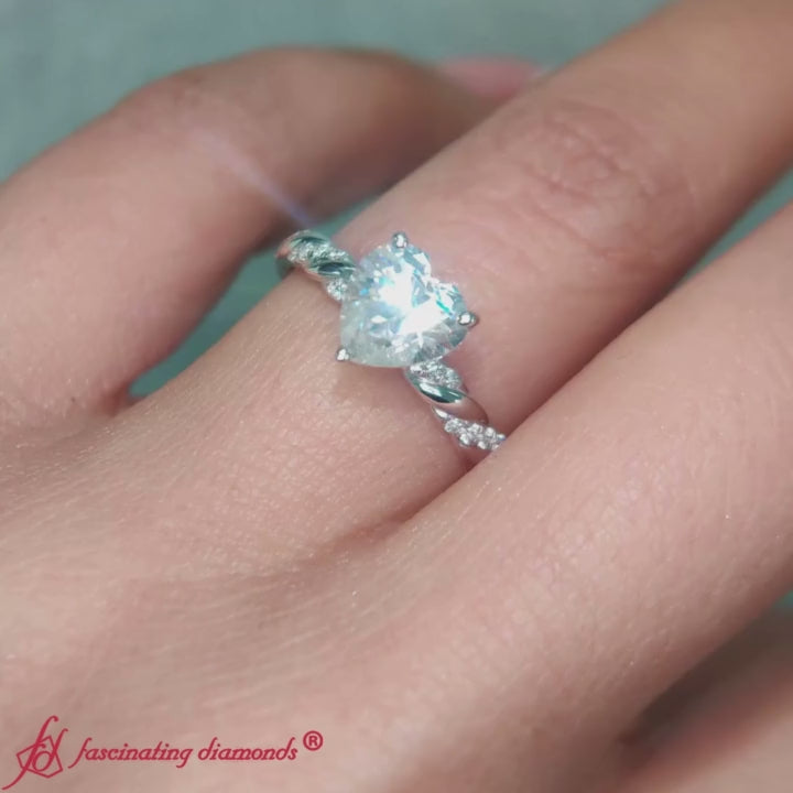 The Twisted Vine Heart Diamond Ring from Fascinating Diamonds highlights a brilliant center stone in a classic prong setting. The band features an entwined vine-inspired design with pavé-set diamond accents, flowing gracefully around the finger showcasing a symbol of unity and everlasting love.