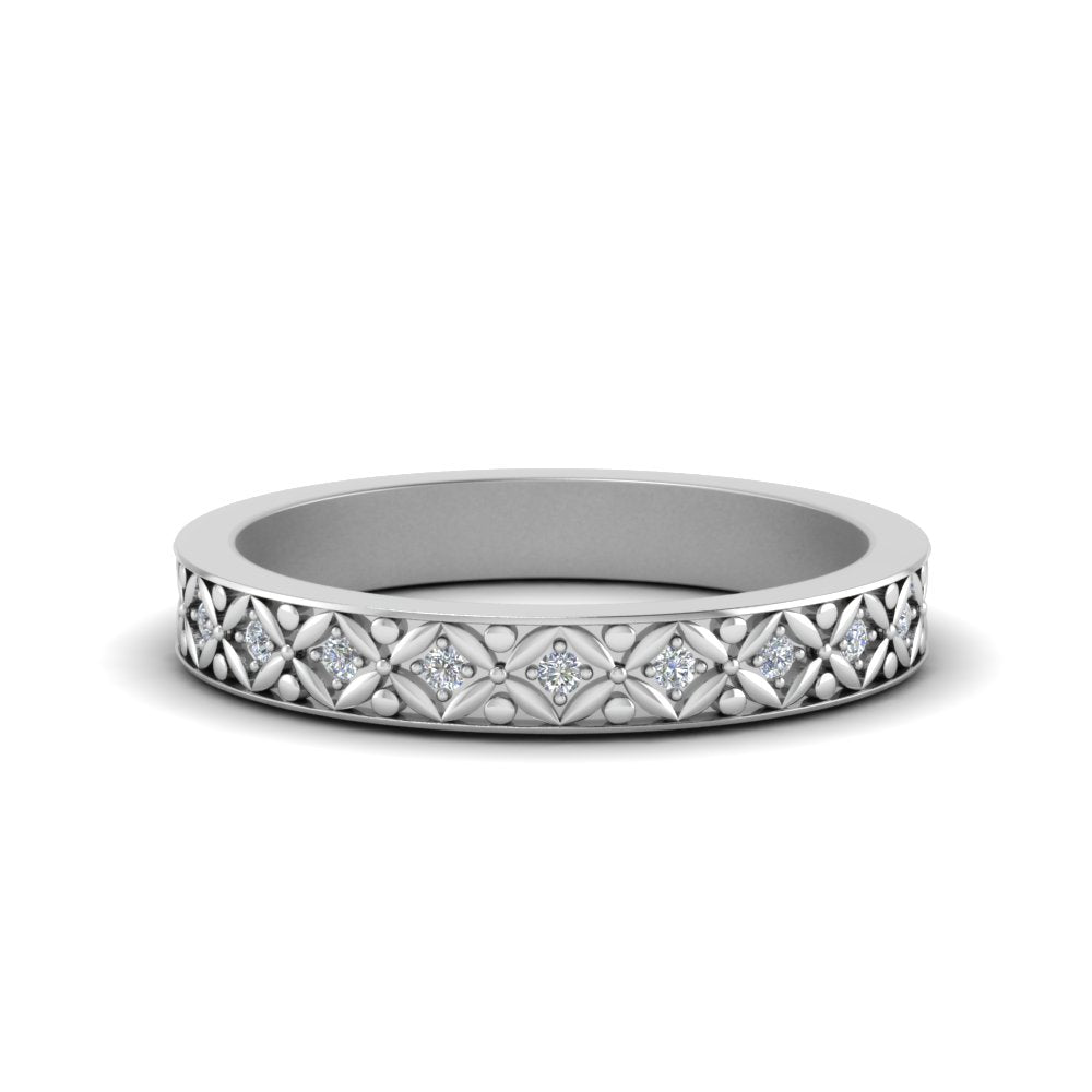 This Vintage Eternity Band For Her exhibits artistic engraved floral design over the shank with round shaped diamond in a prong setting. Designed to fit perfectly and complement your engagement ring.